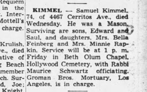 In the first Kritzer book, I talk about the grandpa that I actually liked – my father’s father, Grandpa Sam (as he’s called in the book). As I wrote, he used to take me to the Picfair when I was five to see serials and movies, he knew I loved Commando Cody’s Rocket Jacket, and he often talked about how we might make one. In the book, he does, but in life it was just a dream. And I talk about when he died in 1956, how I was awakened by my mother wailing in the kitchen. I got up to see what it was about and that was the first time I actually knew and cared about someone who died. I didn’t even really know what it meant, other than I wouldn’t be seeing him again. Here’s the obituary.
