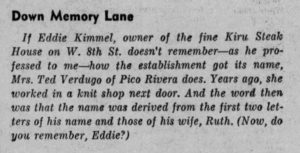 Also, in the Kritzer book I talk about how my father’s restaurant got its name, but with Kritzer instead of Kimmel. In the book, the restaurant is called the Erro and at some point I find out that the story we’ve always been told about how the name came to be wasn’t true and that the initials stood for ERnie (what I named him in the book – real name, Eddie) and the RO stood for the first two letters of his first wife’s name. That was all true save for the name changes for the book. My mother forbade him to ever mention this other wife and in actuality I didn’t find out the real story until the 1970s. But in searching my father’s restaurant, whose real name was the Kiru, I found some restaurant column, where he told this wacky, totally made-up story of how the restaurant had gotten its name. It was colorful, kind of an Arabian Nights thing. Well, this columnist found out the real story and amusingly called him out on it – and I found it.