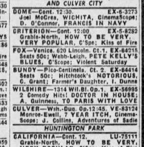 Isn’t that mind-boggling? The other day, I was searching and searching to see when the movie Wichita had played the Dome Theater in Ocean Park. I knew I’d seen it there, close by where my grandparents lived. I found when it opened, but it wasn’t at the Dome, and I searched and searched and could find no evidence that it ever played there. The closest theater that I found was the Fox Venice. Could I be that off? Thankfully, the answer is no, because I searched the title specifically and found it. Here’s the living proof.