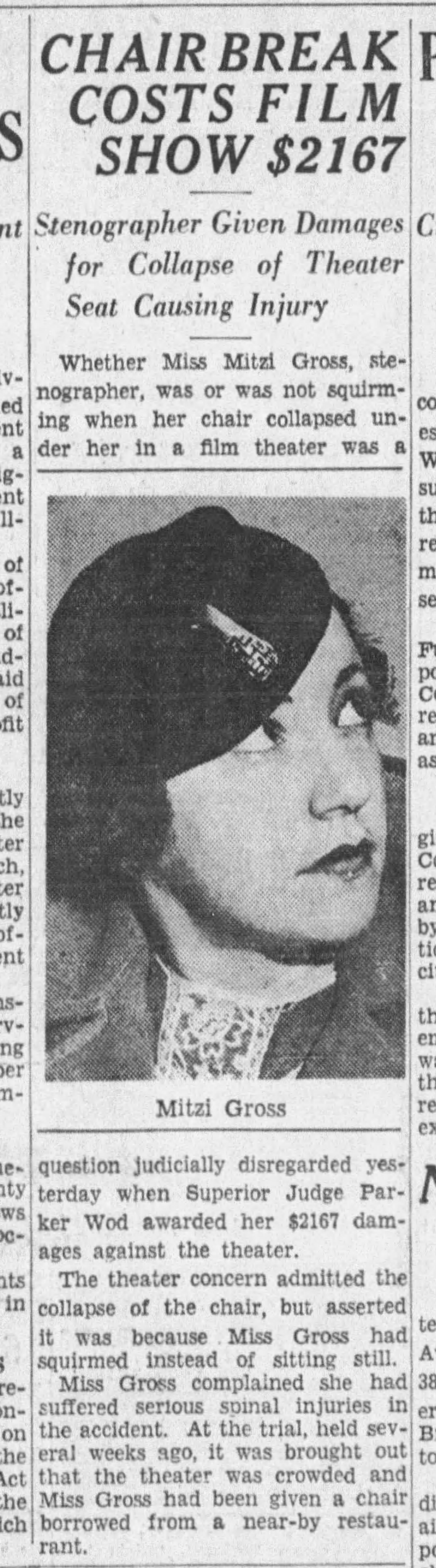 When I was young, perhaps nine, I wanted to see a movie called Omar Khayyam, which was playing at a movie theater on Wilshire Boulevard in the Miracle Mile, call the Ritz. My mother had regaled us kids with the story of how she was injured there because they’d been sold out and had to put her in a folding chair, which had folded and caused her to topple to the ground. She tried to make it seem like it was dangerous to go there, which is why I’d never been. But I wanted to see Omar Khayyam and there was no dissuading me from taking my chances at a matinee that I doubted would be full. She told me the story again and I didn’t care. And I saw it without incident. I’d always assumed this had happened in the early 1950s. Well, no, it happened in 1935, before she’d met my father. How do I know this? Because I searched her maiden name on newspapers.com and found that the Los Angeles Times thought it newsworthy, because she’d sued the Ritz and won. And here it is, complete with a photo. I’m not sure I’ve ever seen a photo of her quite this young.