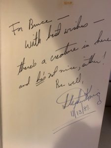 I just loved the film, every second of it, and saw it three or four more times during that first couple of weeks. I’ve owned it on every format save for Blu-ray because I knew the overseas releases were the DVD master. But the transfer on Amazon Prime is new and it’s pretty nice. I don’t know if it’s what Shout Factory released, which is from a new 4K transfer off the camera negative, but I’ll find out soon. I hadn’t seen the film in sixteen years, which surprised me. The cast is wonderful – Brooke Adams, Herbert Lom, Tom Skerrit, Anthony Zerbe, Martin Sheen, Colleen Dewhurst, and a lot of very good Canadian actors. You really care about the characters, which is why it works so beautifully. It’s very emotional and very moving, has some nice humor, and it’s perfectly directed with none of the over-the-top Cronenberg gross out moments. It also has a wonderful score by Michael Kamen. It’s beautifully designed and photographed and there’s only one misstep in the entire movie, at least it is for me, and that’s where the true nature of a character is revealed and which robs us of finding out that nature when Walken does, which would have been much more chilling. Other than that, I find it a perfect film. It was fun seeing it again and if you’ve never seen it and have Prime, it is highly recommended by the likes of me. When it came out, I’d completed filming The Creature Wasn’t Nice. One of our producers was very friendly with King so I asked her to get him to sign a copy of Cujo for me. She did. And I love his inscription, which is perfect. Here it is.