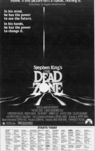 Well, dear readers, shall we speak of Stephen King? I think we should speak of Stephen King, don’t you? I just happened to watch a motion picture on Amazon Prime based on a Stephen King novel, said motion picture and novel entitled The Dead Zone. But before I get to The Dead Zone, let me tell you of my introduction to Mr. Stephen King. And my introduction wasn’t from reading a Stephen King novel, it was via the motion picture Carrie, which I loved. I knew Mr. King’s rise to fame was coming very fast after Carrie and he was already building an amazing fan base, thanks to his first few books that followed Carrie, which were ‘Salem’s Lot, The Shining, the short story collection, Night Shift, and then The Dead Zone. Of course, there were two paperback originals during that period, Rage and The Long Walk, but no one knew that Richard Bachman was Stephen King at that point. So, after I saw Carrie, the first King book I actually read was The Shining, which I absolutely loved and which I finished reading while standing on line to see the first evening show of Kubrick’s film. That was a huge disappointment after reading the book – you could just feel it in the audience. From there, I read The Stand, which I enjoyed but found endless. Then next I read The Dead Zone, which became my favorite King novel up to that point. Interestingly, I never went back and read Carrie or ‘Salem’s Lot or Night Shift until much later, but I did read each new King book the day they came out from The Dead Zone on. And I loved the next few books – Firestarter, Cujo, Needful Things, and Christine. After that, I didn’t quite read everything, just occasional things like Misery, It, The Tommyknockers, and Dreamcatcher. Dreamcatcher was the last book of fiction I read for at least eighteen years, because I began writing my novels and I didn’t want any writer influences. So, the only King novel I read after that, was two or three years ago, when I read 11/22/63, which I enjoyed very much, although like many of his books, I felt it was too long and went off on too many tangents. I also began collecting first editions around 1979 and had everything up to then and bought each new book as it came out, including the signed limited-edition things. While I loved the film Carrie and grew to appreciate The Shining, I didn’t love the films of Firestarter or Christine. Cujo was a good movie, I thought, and then much later I really thought Misery was a good adaptation. But the best of all of them was the film of The Dead Zone. Directed by David Cronenberg and starring Christopher Walken in what I think is his finest performance, I saw it the day it opened – at the Bruin in Westwood if memory serves – well, let’s just see – yes, the Bruin. Here’s the ad.