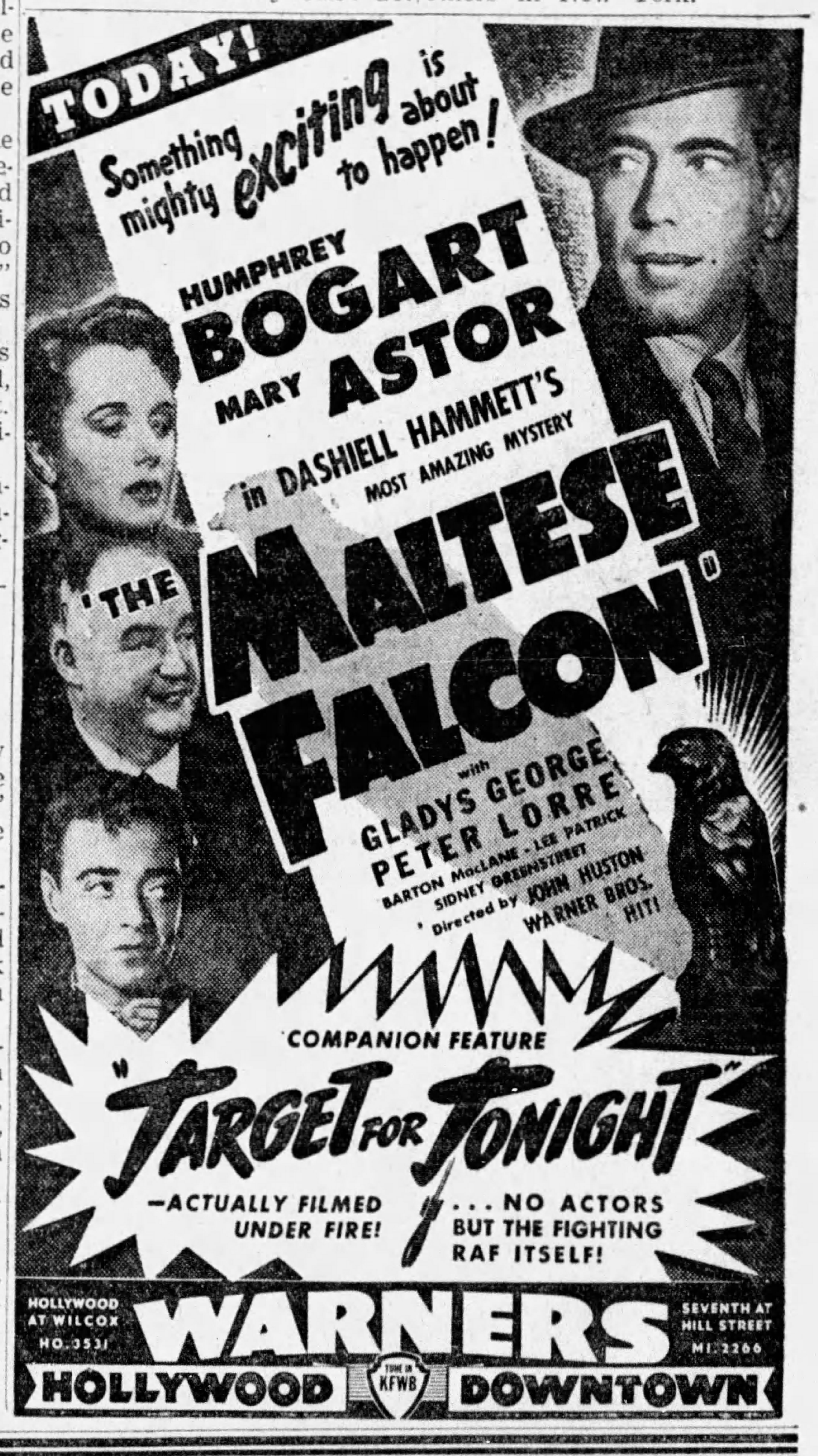 Well, dear readers, I have decided that today’s notes are the stuff that dreams are made of. Yes, you heard it here, dear readers, I, BK, have decided that today’s notes are the stuff that dreams are made of. Why? Why not? After all, I am in possession of my very own Maltese Falcon replica Maltese Falcon and I also watched a motion picture on Blu and Ray called The Maltese Falcon, starring Mr. Humphrey Bogart, Mary Astor, Sidney Greenstreet, Elisha Cook, Jr., Peter Lorre and others, written and directed by John Huston and adapted from the novel by Dashiell Hammett. It is a motion picture classic that I simply do not know as well as I should – I have seen it all the way through exactly twice. Why is that? I know it’s a classic, it smells like a classic, feels like a classic, and IS a classic, so why don’t I love it like it’s a classic? I certainly enjoy it, but I have simply never loved it. On the other hand, I love The Big Sleep, so go know. That one I can watch all the time and it never gets old. But that is not the one that dreams are made of, The Maltese Falcon is the one that dreams are made of. Oh, well, I suppose I’ll be the contrarian, although I must stress again that I certainly enjoy it. Otherwise, I am sitting here like so much tired fish, finishing up the Juilliard String Quartet box set. Some of the music herein is a little TOO modern for the likes of me, but there are many, many gems and all the performances are wonderful. There are several other box sets, too – their Epic recordings, their RCA recordings, maybe even their Sony stereo recordings. I’ll have to check out what’s on them. That was pretty much the evening. Oh, and here’s the opening day add for the stuff dreams are made of.