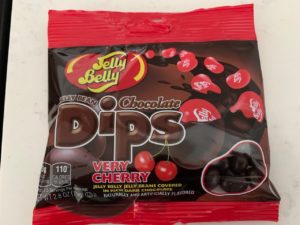 Then I watched the sequel thing, after which I began listening to the remainder of the Hilary Hahn set – interrupted by a brief conversation with the musical director of the singer’s act, just to talk through a few things. I had a bagel for my snack, and for a sweet I had my new obsession, chocolate covered Chocolate Dips Very Cherry jellybeans from Jelly Belly, which make me very cheery. I discovered these about six weeks ago and I just love them. I have found of late that my tummy is not doing well with any kind of frosting on cake or that kind of thing, and I can’t do frozen yogurt – it’s just not digesting well. But these Jelly Belly things are fine and so are a few other things. I also can’t handle donuts right now – and that’s mostly the chocolate icing or the apple fritter kind of thing. Here’s a photograph of this new Jelly Belly treat. I’m sure the minute I post these here notes, that they’ll be sold out the next time I’m there.