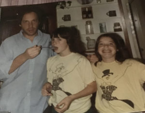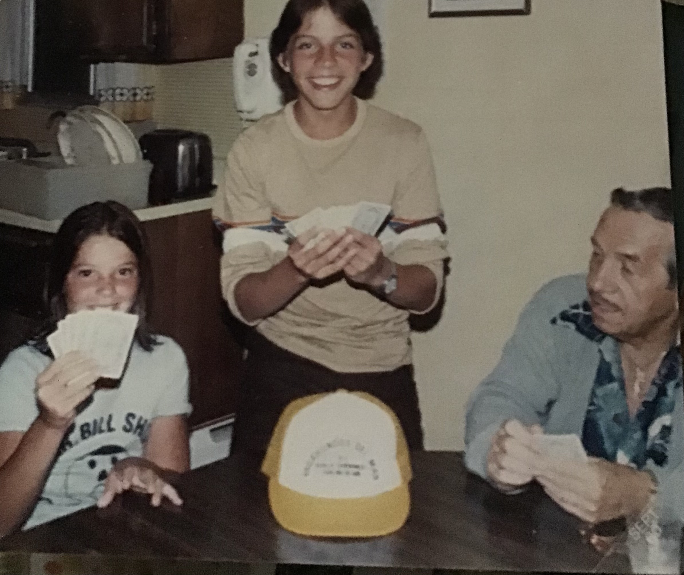 On the left we have the Darling Daughter in a Mr. Bill Show t-shirt, her cousin Devon, and her grandfather Tony, my ex-wife’s father. I like to think the Darling Daughter is holding the winning hand.
