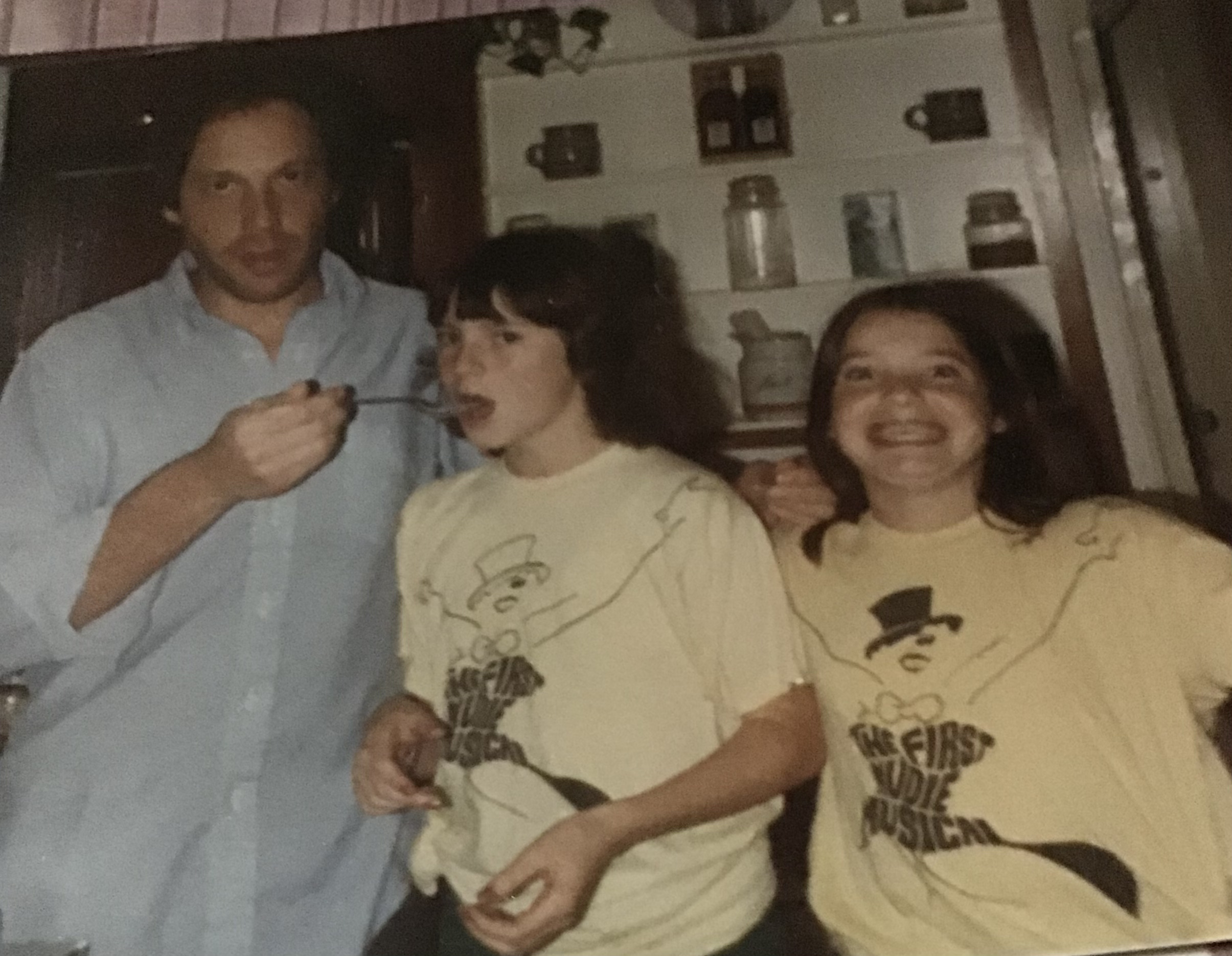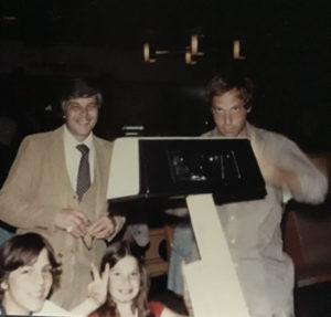 Speaking of shirts, check out the shirts on the Darling Daughter and I’m not sure who the other person is – could be cousin Devon again but I don’t think so. I do wonder what I’m trying to feed whoever it is. This had to be 1977 for this one because that’s when that logo was created, for the rerelease of Nudie Musical from its new distributor.
