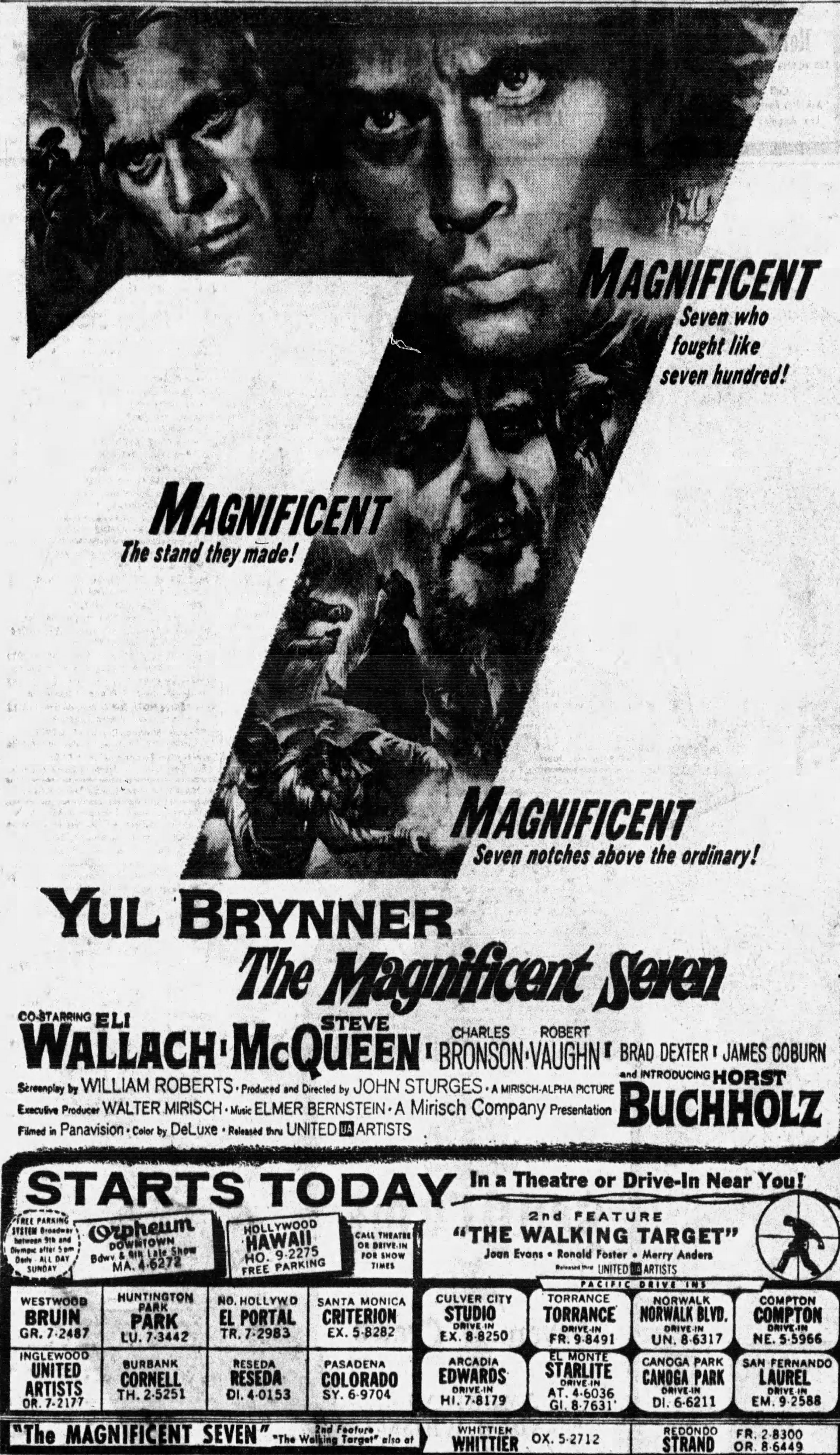 Well, dear readers, I am sitting here like so much fish, listening to some French musique by French composer and Frenchman Philippe Gaubert – very melodic and lovely French music it is, too. Tableaux symphonique – Les Chants de la mer is the piece and it brings to mind the many moods of the mer. I love the many moods of the mer, don’t you? I myself have never written a song about the mer or any body of water, at least that I recall. What I do recall, however, is that I am writing these here notes late so I must not waste any more time writing about the many moods of the mer, for time and tide wait for no man, woman, or beast, not necessarily in that order. I must write in waves. I must write like a what is it, fish out of water or these here notes will be a drop in the ocean, and we must have easy sailing, notes-wise. Earlier, I was writing a tune that tickled my ear – have no idea what I’ll do with said tune, but my ear has been tickled and is laughing up a storm. I did watch a bit of a funky old motion picture entitled The Walking Target, a grade Z motion picture from 1960 featuring the all-star cast of Joan Evans, Ronald Foster, and Merry Anders. It’s a typical heist film wherein the money is hidden, and people are after it. Shot in Los Angeles, California at the Samuel Goldwyn Studios on Santa Monica Boulevard, the robbery takes place on Formosa, right near the studio. Later, they’re purportedly in Arizona but those scenes and especially the house looked very Valley to me and indeed a little searching told me it was the Valley – Woodland Hills to be exact and that house is still there and looks exactly the same, save for the gate in front of it. It was directed by Edward L. Cahn, the man who gave the world Invasion of the Saucer Men, It! The Terror from Beyond Space, and The Four Skulls of Jonathan Drake. No slacker he, in 1960 Cahn directed eight movies and in 1961 he made eleven movies. Those days are gone, sadly. This film opened in Los Angeles, California on Wednesday November 23, 1960, as the bottom half of a double bill – the top half being a little something called The Magnificent Seven. Here’s the ad for it.