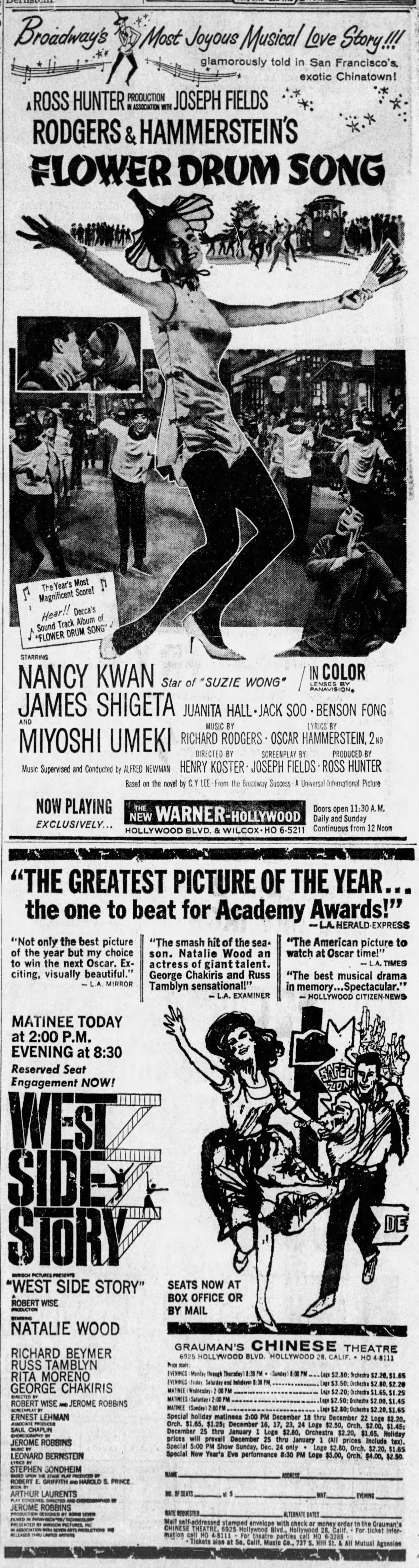 I know that the following day I was back at West Side Story, but I returned to Flower Drum Song several times before school started up again. I still love the film, especially Alfred Newman’s amazing work on the score – I don’t care for Robert Russell Bennett’s show orchestrations – one of the few fails I’ve ever heard from him – Newman’s are better every step of the way. I loathed the revised version and I’m here to tell you the original still works just fine. It’s set in a very specific time period and it’s just so typical of today that no one can watch anything and understand the context. There had never been a film that gave so much work to Asian American actors. The musical’s themes are universal and frankly while I know some people are offended by it, I found the revised version offensive in certain ways. The Blu-ray sounds great and it’s nice to have it – it’s miles better than the old DVD. It contains a commentary by our much-missed Nick Redman along with Nancy Kwan. I had the pleasure of lunching with Nick and Miss Kwan – that was a special day. The other extras from the DVD are also included. Here’s the opening day advertisement along with West Side Story’s below it. What a time!