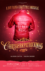 What I knew about the musical phenomenon of the 1990s known at the Boy Band Era would easily fit on the tiniest of post-it notes before I viewed Chriskirkpatrickmas: A Boy Band Christmas Musical at the Hollywood Fringe Festival. I knew Lance Bass and Joey Fatone were members of NSYNC only because they appeared on Dancing with the Stars. I knew Marky Mark from his Calvin Klein underwear ads. So, it would probably help you enjoy the show even more if you had more Boy Band knowledge than I before entering the theatre. However, co-writers/co-lyricists Valen Shore and Alison Zatta do a good job of filling in the history of the group while also creating a nice mash-up of the holiday classics It’s A Wonderful Life and A Christmas Carol. It’s a fun evening of music and parody. Shore also contributed the music while the duo also acted as co-directors.