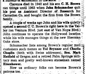 Yesterday was some kind of day. I got up at nine-thirty after six-and-a-half hours of sleep. I answered e-mails and did stuff but went back to bed and slept until one – I believe I got a little over eight hours of sleep. Once back up, I caught up on stuff, then got ready for the stumble-through. Dear me, yesterday didn’t even take up one page of these here notes. That may be a first. Then again, that may be a second. I know not which. Oh, and here was a surprising thing I learned from searching C.C. Brown’s on newspapers.com. This goes in the “Who Knew” department. I wish I had the exact address of where it was. In 1968, John Schumacher opened a second branch of C.C. Brown’s in Sherman Oaks, near Ventura and Van Nuys Blvd. I do believe there once was a Wil Wright’s around there, so maybe it was in that location. Yes, Wil Wright’s was on the northwest corner of Ventura and Van Nuys (now a gas station). It must have not lasted very long and since I can find no record of its existence anywhere, maybe it never happened at all. Here’s the article I found.