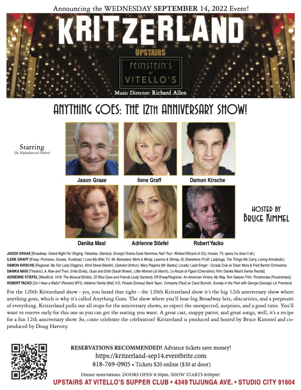 After lunch, I came right home, had a long telephonic conversation, answered more e-mails, got a pass from one of our asks – I didn’t really know the person, and that’s always a long shot. The folks I know and have worked with usually say yes if they’re available. At least, so far they have. I did a few things on the computer, then began watching the Kleo limited series. At about eight, I figured I’d only had about six or seven hundred calories, so I ordered a Chinese chicken salad from Stanley’s – it’s pretty light, so that was a good evening repast. Then it was back to the limited series, then sending a lot of e-mails again – also, announcing the Kritzerland anniversary show. Here’s the flyer for that.