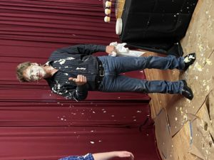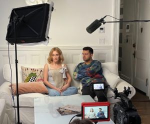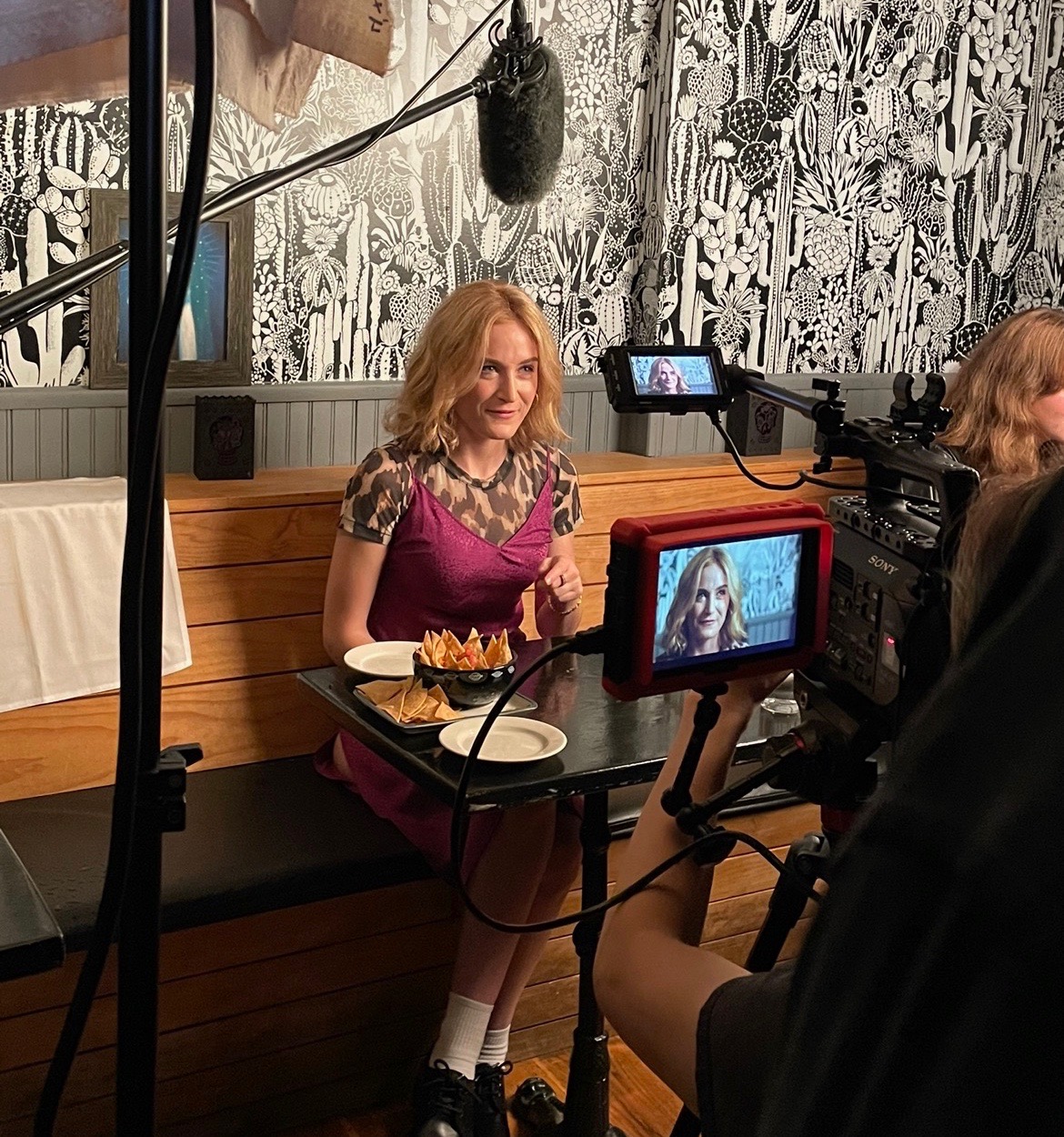 The first thing I did when I arrived was rehearse the duet Sami’s doing with the delightful and talented Allie Trimm – I staged it simply and they’re going to be wonderful doing it. Then I began discussing how we’d shoot this with the cameraman. I think it was confusing to him, so I gathered the actors together who are the main part of the sequence and blocked it – I’d already drawn how I wanted to shoot it. The cameraman watched it and then totally understood what we had to do. We had seventeen extras and six main people. And fifty pies. I’d already had our wonderful props person do a test of the pie hit and when I saw it I knew that part of it would work great. And it made me giddy with joy to see it. So, we got the set up done fairly quickly. A short scene with Sami and actress Angel Reda playing her fellow server. Angel did an early Kritzerland show and also was in the Chinatown episode of Outside the Box.