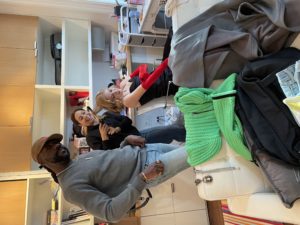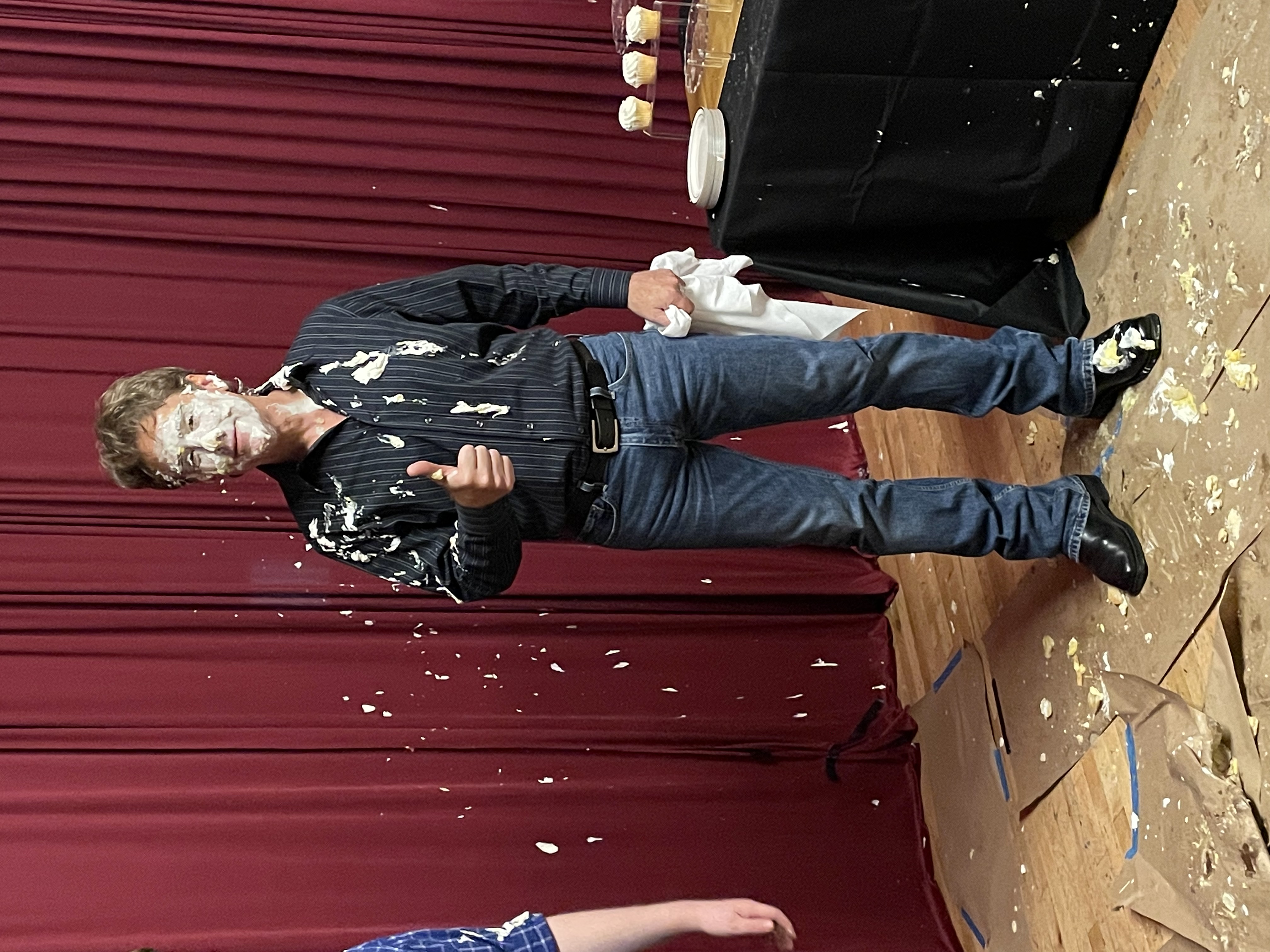 There were two versions of the pies – all had vanilla pudding on the piecrust. The initial couple of pies had shaving cream as the whipped cream. But the majority of the pies had Cool Whip and I liked that better because it was creamier-looking. And that, dear readers, was pie day.
