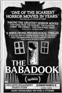 And so it was with The Babadook, an Australian movie that never overstays its welcome. The good thing about it is it has more on its mind than your typical horror movie. It’s got a completely annoying kid in it who gets on your nerves from the start, and one wonders how mom, still grieving years later over the loss of her husband in a car accident as he was driving her to deliver the baby, can take hearing this kid’s voice and yelling. I don’t want to say more, other than a book that mom has never seen is brought to her for bedtime reading by the boy. The book is called The Babadook, a pop-up book that’s a horror movie unto itself. I enjoyed the film very much and the leading lady, Essie Davis, gives an absolutely fantastic performance. The film wasn’t a hit, but was really well reviewed and, as these things go, developed a large cult following. It opened here in LA on November 28, 2014 in one low-rent theater on Fairfax (the Silent Movie Theater) and video on demand the same day. The LA Times review was a rave and really “got” the film. Mirroring what I said above, the reviewer wrote, “At one point, as his (the boy’s) screeches fill the car, you may wonder how his mum has managed to go this long without strangling him.” He goes on to say, “And that’s the subtext running through the film – the threat of imaginary monsters and the real ones humans are capable of becoming.” The other paragraph that gets it right is, “While The Babadook is well-crafted enough to satisfy the screaming-teen set, it is not catering to that crowd. Kent (the director, Jennifer Kent, whose first film this was) has given us a grown-up horror tale in the tradition of Rosemary’s Baby, Psycho, and The Exorcist.” I don’t think it lasted out the week at that tiny theater. Of course, it was dwarfed by a Hunger Games movie, Interstellar, The Imitation Game, a couple of big animated things, and more. Those all had full page color ads. Here’s the ad for The Babadook – barely an eighth of a page.