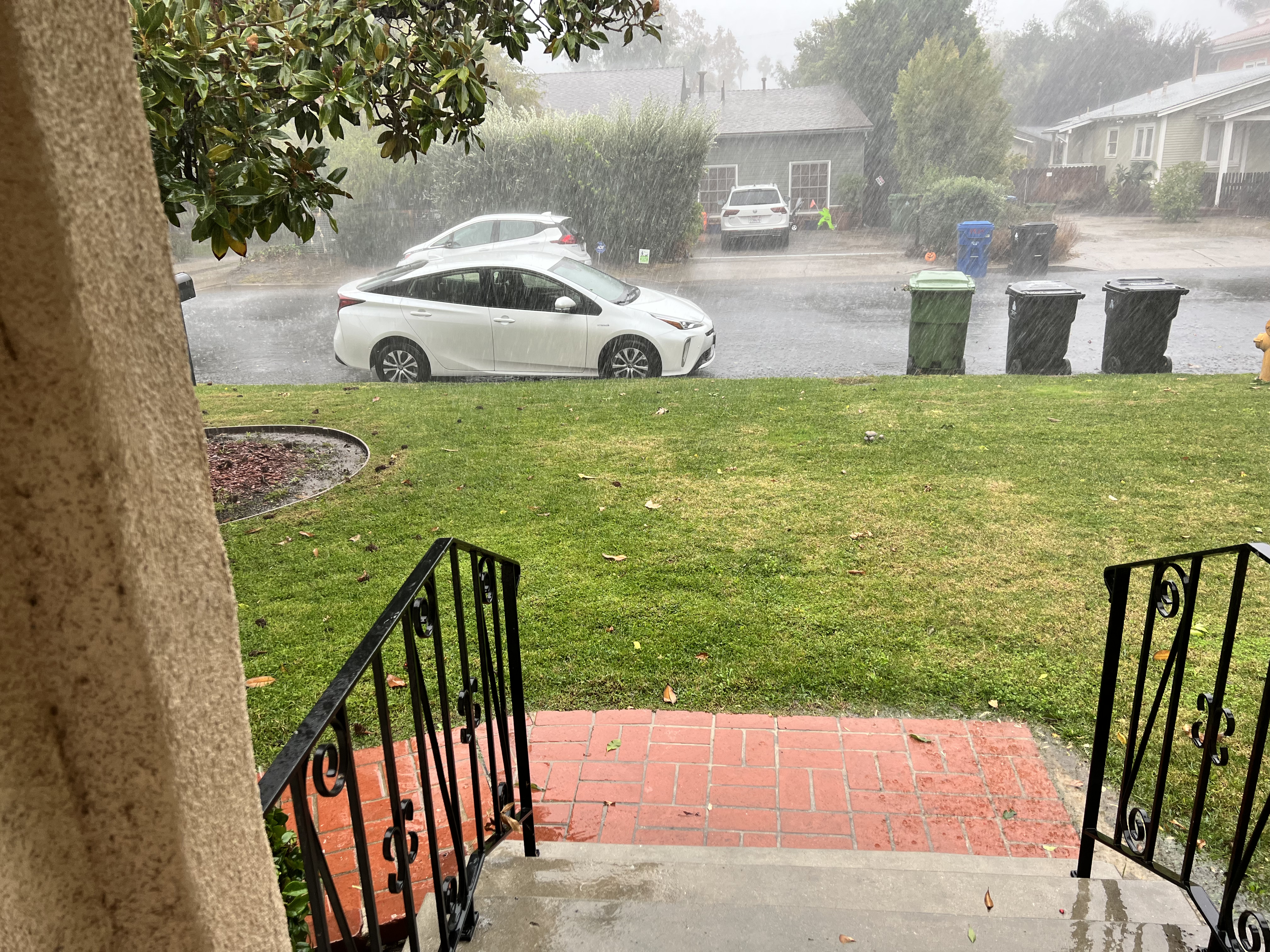 Well, dear readers, I have breaking bombshell news for you: We had us some real old-fashioned rain, we did. No, it didn’t last for hours, but when it was coming down it was coming down heavily. It was fun to see it when I opened the front door. In fact, I snapped an actual photograph of it. Here is the proof.