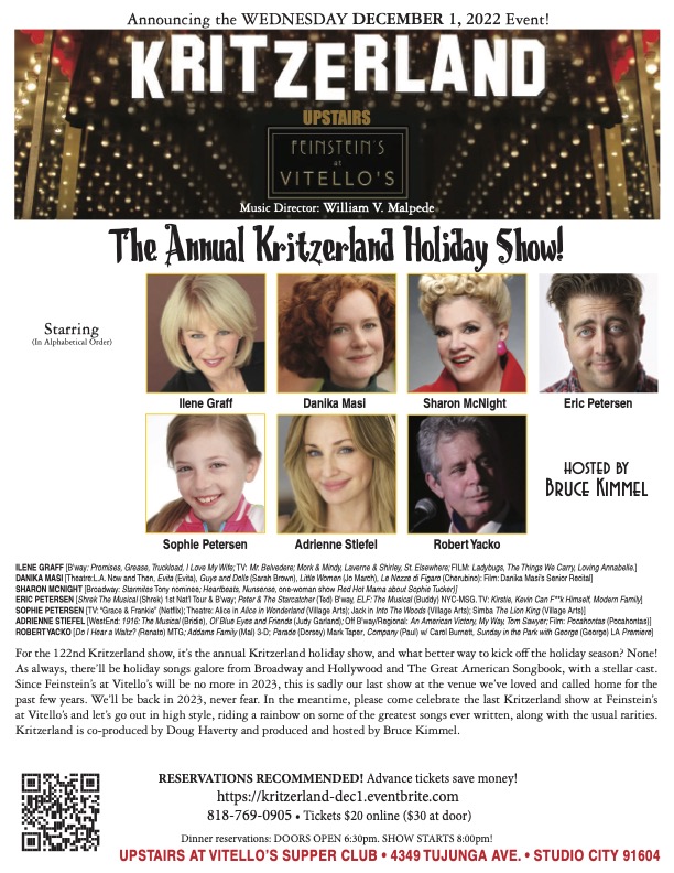 Prior to that, I’d only gotten three-and-a-half hours of sleep – rough night in Jericho. But since I was up for several hours, it did enable me to get all the orders forwarded, so that was good. Once up for good at ten-thirty, I answered e-mails and then the helper arrived at eleven and we got the rest of the Indiegogo perks loaded into her car. I’m still missing a couple of books that I have to order – hadn’t realized I was out – and that will be that. Then I shaved and showered, did some work on the computer, announced the Kritzerland show on Facebook and reservations have already begun to come in. I also made a deal to continue our shows in another venue, but I can’t say where just yet – but that’s a big load off, let me tell you and I have told you. Here’s the flyer for the holiday show.