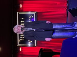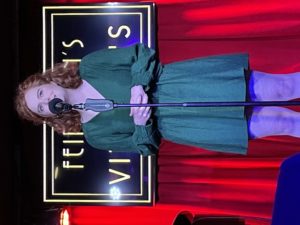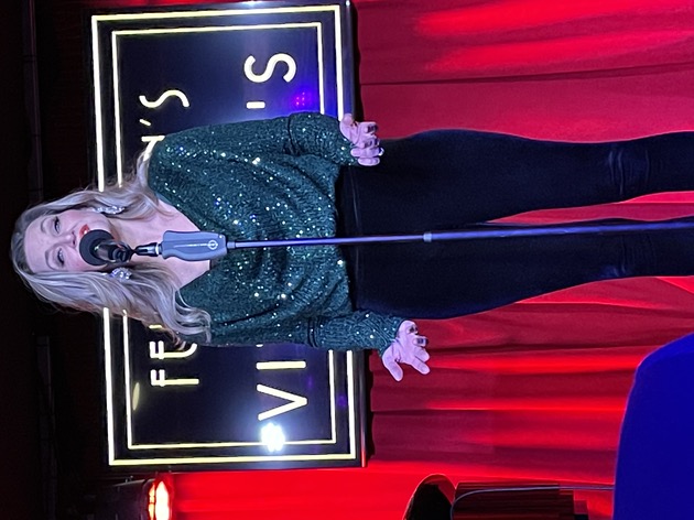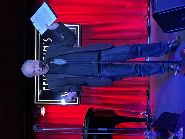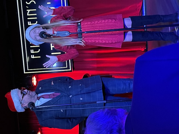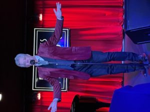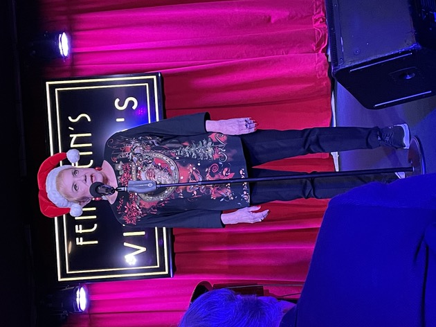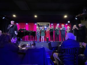 At that point, I usually bring the cast back out for a final bow and we do our sing-along. But instead, I told the audience that I wanted to do a song as our farewell to Vitello’s and I brought up Kay Cole, who sang What I Did for Love. It was magical and then I brought everyone out and we and the audience all sang White Christmas. It was such a great way to start the holiday season. We’ll miss Vitello’s. We’ll be back in January, coming full circle and going back to where we began our shows in 2010 – The Gardenia, doing Sundays at seven with the first show of 2023 being our all young folks show on January 15. Here are some photographs. Here I am, showing the paper I must read from.