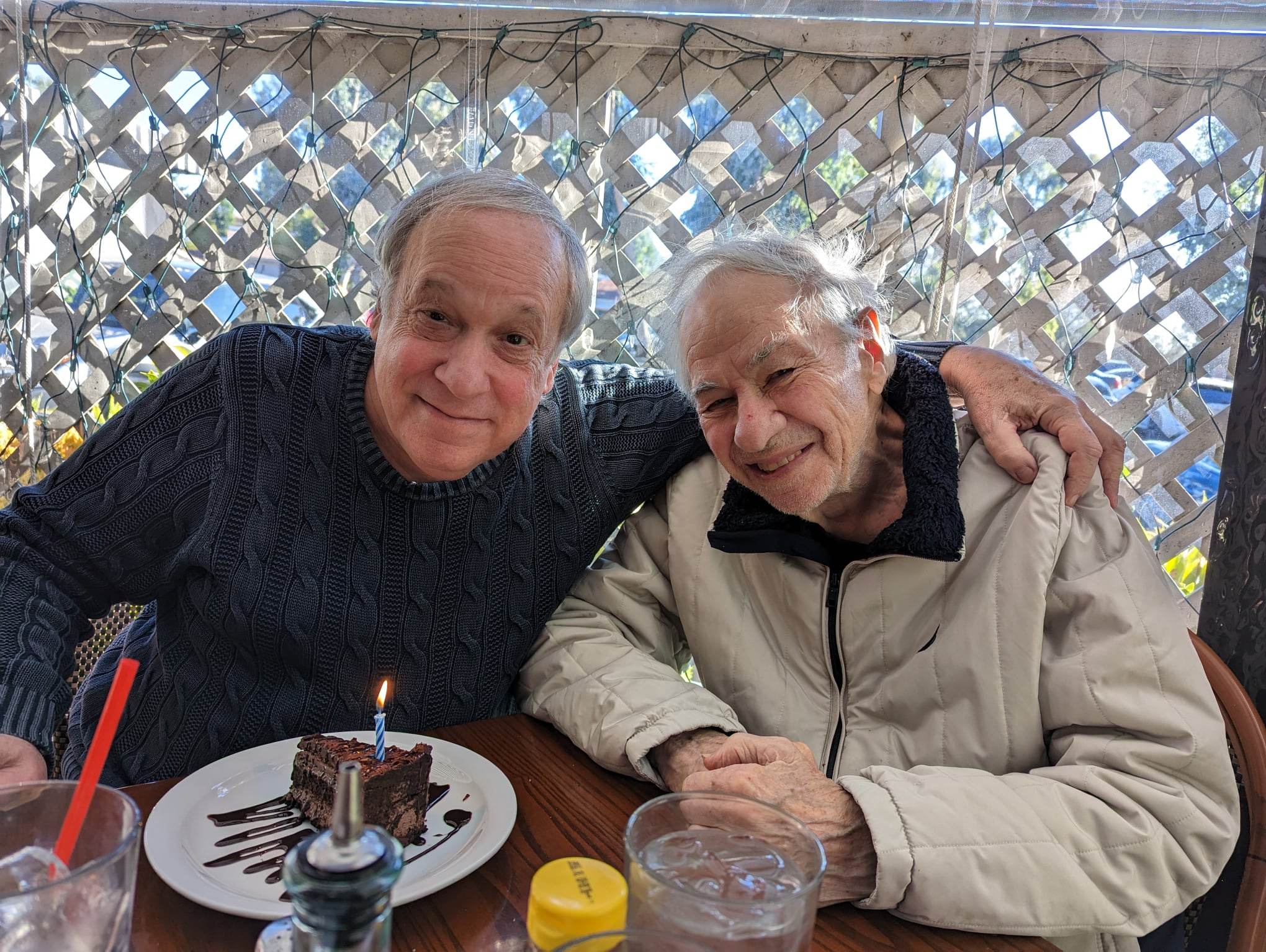 Once home from the lunch, I spent much time doing the “liking”, had more telephonic calls, then for my evening meal I got a turkey sandwich delivered from a deli in the same little mall where Farbrocini’s is. It wasn’t too big and it was very good. I didn’t eat much else. The Darling Daughter sent a package containing cookies of her own making, chocolate-covered red licorice she does herself, and some cake in a small jar. Then I watched the motion picture and then had another long telephonic call, which is why these here notes are going up late, and that was the birthday. Here’s Richard and me at the restaurant.