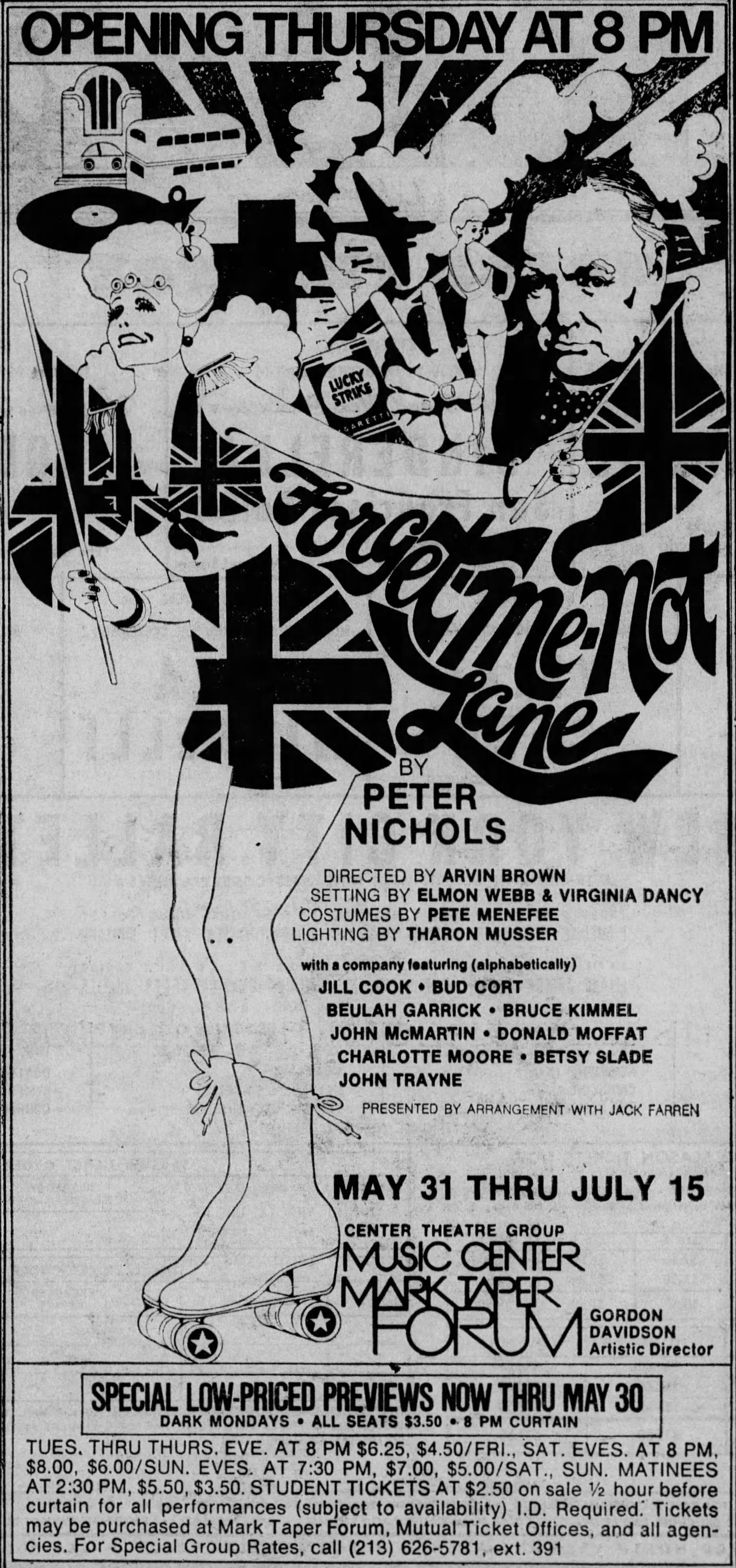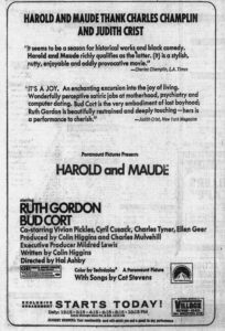 Well, dear readers, I am sitting here like so much fish, still listening to the wonderful music of Louis Glass, his fifth symphony and now his Fantasie for piano and orchestra. His music has a very English pastoral quality and since I’m frequently in an English pastoral state of mind, I’m all for it. I’m currently in an English pastoral state of mind, relaxing as I write these here English pastoral notes. Before I continue, has anyone noticed that this is the final day of February? I really do not like February due to its irritating brevity and the fact that one has to pay all the first of month bills two days early. But tomorrow is another month, namely March, and it is my fervent hope and prayer that March will be a month filled with health, wealth, happiness, creativity, and all things bright and beautiful. Other than that,  I can tell you about two motion pictures, though. I’ll dispense with the first as quickly as possible: It was entitled The Other Man and starred Liam Neeson, Antonio Banderas, and Laura Linney. It’s one of those fractured timeline movies that doesn’t play fair with the audience so they can have a “surprise” at the end. I went along with it for the first twenty minutes and then it just got sillier and sillier and then became completely risible. I couldn’t understand a single word Mr. Banderas said and given the script that was probably a good thing. But the second movie, which I hadn’t seen in quite some time, was wonderful – Harold and Maude. I’ve had the Blu-ray since it came out but have never watched it and I still haven’t because I just watched it on Amazon Prime. While I’d heard of it, I missed it during its original run, so when I was cast in the Peter Nichols’ play Forget-Me-Not Lane opposite Bud Cort, I didn’t really know who he was. I quickly learned that the film had a huge cult following. Like the movie Smile, everyone thinks Harold and Maude was some huge hit. It wasn’t. Paramount didn’t have a clew as to how to sell it – they opened it at the Village Theater in Westwood a few days before Christmas with a not very big ad that was a amateurish as the ads for the LA run of The First Nudie Musical. It played the Village the same exact number of weeks as Nudie Musical – two. That was at the end of December 1971 into early January of 1972. Then a few weeks later it went wide with a new ad that was barely better than the original. And to give you an idea of just how little Paramount thought of it and how little business it did at the Village, the wide release had the worst theaters around town – in Hollywood it was at the horrid little dump of a theater, the Holly. The Embassy on Western, which was a rat hole, the tiny 150-seat Cine-Cienega on La Cienega, and a very small number of other theaters, but no further run on the west side except a small theater in Santa Monica, plus some drive-ins, on a double bill with Goodbye, Columbus. And a week later it was gone, playing bottom half of double bills at bottom of the barrel theaters. So, it’s amazing that anyone saw it, but they did via word of mouth, but a small group and the fact that Paramount kept putting it on the bottom half of double bills, which is how I finally saw it, because I heard so much about it from Bud. NOW everyone thinks it was a big hit and a crown jewel from Paramount but let us never forget how they treated that film and of course my film. Much later, the revival houses got it. The film holds up very well and the humor is just as black now as it was then. Above all, Bud is amazing in it and so is Ruth Gordon and especially Vivian Pickles, who is hilarious as Bud’s mother. Bud and I became close pals all during the run. He didn’t really drive so I picked him up (he was staying with Sally Kellerman at the time) and took him to rehearsals. We dined out ofter after the show at the little coffee shop downstairs. And opening night, Groucho came and saw the show because Bud and he were great friends. And then came the memorable evening when Bud called and said to get over to Groucho’s because Groucho felt like singing. That episode along with many others is in There’s Mel, There’s Woody, and There’s You. Then I didn’t see Bud again until 2015 in New York, when we did the Kritzerland shows there. I dined with friends at Joe Allen one night and this guy kept staring at me and staring at me and he finally came to the table and asked if I remembered him – I didn’t recognize him until he said his name – Bud Cort. Here is the opening day ad for Harold and Maude.