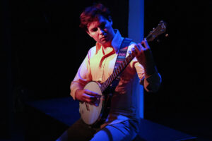 The two lead characters are double cast for some reason. The duo I saw managed to make the most of their scenes, especially those where they were alone on stage. They had good chemistry and created believable characters. They are the heart and soul of the play. As Maude, Clara Rodriguez is a little spitfire as the soon-to-be-octogenarian, whether she is rescuing a tree from the city smog or eating nuts at a funeral. Landon Beatty’s Harold starts off quiet and reserved, as formal and colorless as the button-down clothes he wears. He is delighted to find someone who also enjoys going to funerals and he slowly comes alive under Maude’s tutelage. Their budding romance is believable in their assured hands. At curtain, Harold’s clothes are loose and colorful, and he is embracing life as he plucks his banjo.