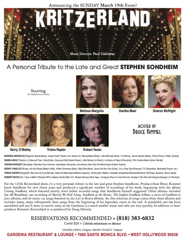 Yesterday was okay and at times very much not okay, but such are the way of things these days. I did get eight hours of sleep, so that was good. Once up, I answered e-mails and then had to get right on proofing close captions for three episodes of Sami – unfortunately, these three were riddled with errors and it took me a long time to get through them, like almost two and a half hours. Then I made me a batch of Wacky Noodles, but for some reason it was less than I usually make even though I measured out the same amount I always do. Bow tie pasta made by Kroger and that won’t be a mistake I make again, because their pasta is kind of rank. After eating, I had a long telephonic conversation, got Marshall Harvey the title cards for the trailer, and then we had to get the flyer for the March Kritzerland show done. I also finished choosing the songs and I got everyone their music, so that’s done. Thanks to dear reader Jrand, I also found us a piano player and fortunately he seems to know his Sondheim and he also saw a Kritzerland show so he knows our vibe and our xylophone. Here’s the flyer for the show.