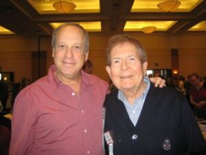 Well, dear readers, Mr. B.I.G. has gone to that big drive-in in the sky at 100 years of age. Growing up, I loved his low-budget movies, especially Attack of the Puppet People and The Amazing Colossal Man. I saw most of his movies when they were released. He loved making movies, and with then-wife Flora, their special effects were very clever for having zero money to do them – just watch the giant grasshoppers in Beginning of the End. When I got to be good friends with daughter Susan, which happened literally five days after this here site was born, thanks to dear reader Jane. I had no idea they’d been in touch until I got a message on AOL – what did they used to call those on AOL, they had a name – AIM which was AOL Instant Messenger. We messaged for hours that first night, and hours the next night, and then it was by phone from then on. On New Year’s Eve a month later, we met in Las Vegas and that was really fun. We became very close buddies and she became a wonderful fixture here at haineshisway.com. I believe we called her our den mother. In any case, I did a commentary track for Beginning of the End with Susan and her mom, Flora. And soon after that, Susan arranged a dinner with Bert and I took him to what would become his favorite restaurant and the only place we went – Genghis Cohen. He loved it there and loved the food and we had the best time that first time and then there were many subsequent meals there. Susan could never talk him into doing the Hollywood Show, where Susan and I signed frequently. She asked me to try, and at one of our dinners I talked him into it with his only condition that I be at the table next to him, and so I was. And, as I knew he would, he loved doing it because he saw just how many fans he had and how much people loved his movies. His daughter Christina was there and she was a delight. Susan was, of course, in New Jersey (I think that’s where it was) with her kids – SIX of ‘em. Of course, we went right to Genghis Cohen afterwards. When he wrote his book, Susan gave me one of the first copies and I found it so riddled with mistakes and confusing chronology that I offered to help him fix it up and I spent a week going through it, moving things around so they made sense, and fixing typos and conforming things so it looked professional. Susan did all those fixes and Bert was very happy with it. I think that was the last time I saw him. Susan passed away way too young, and while I had a conversation or two with Bert after that – he was busy, I was busy and life went on. I think only he and Roger Corman were left from that Golden Age of crazy Z-movies. Here we are at the Hollywood Show.