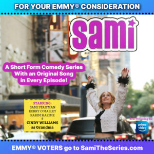 Now, as you know, I’ve been saying for the last couple of weeks that we’ve been doing Sami stuff but that I couldn’t really talk about it. Well, now I can, since it’s finally happening. We are Emmy eligible for several categories and have entered those categories, including best short form series, best actress in a short form series, and then in the regular categories, best song (Simply) and best TV theme. Now we have to get the Emmy voters to watch and to that end we’re on the FYC Emmy site, where they can watch several episodes, the Simply song, and the theme over the front titles. Obviously, the big boys spend huge amounts of money on ads and inundating the voters with stuff. We can’t do that, but they do do two big eBlasts for our show, so that’s good, and I do know quite a few Emmy voters and will be asking them to please watch and if they like us to please vote. It’s a long shot but we’ll just be the little show that could. They’re VERY picky about eligibility, so we’re just so pleased to be eligible. Here’s our little graphic for it.