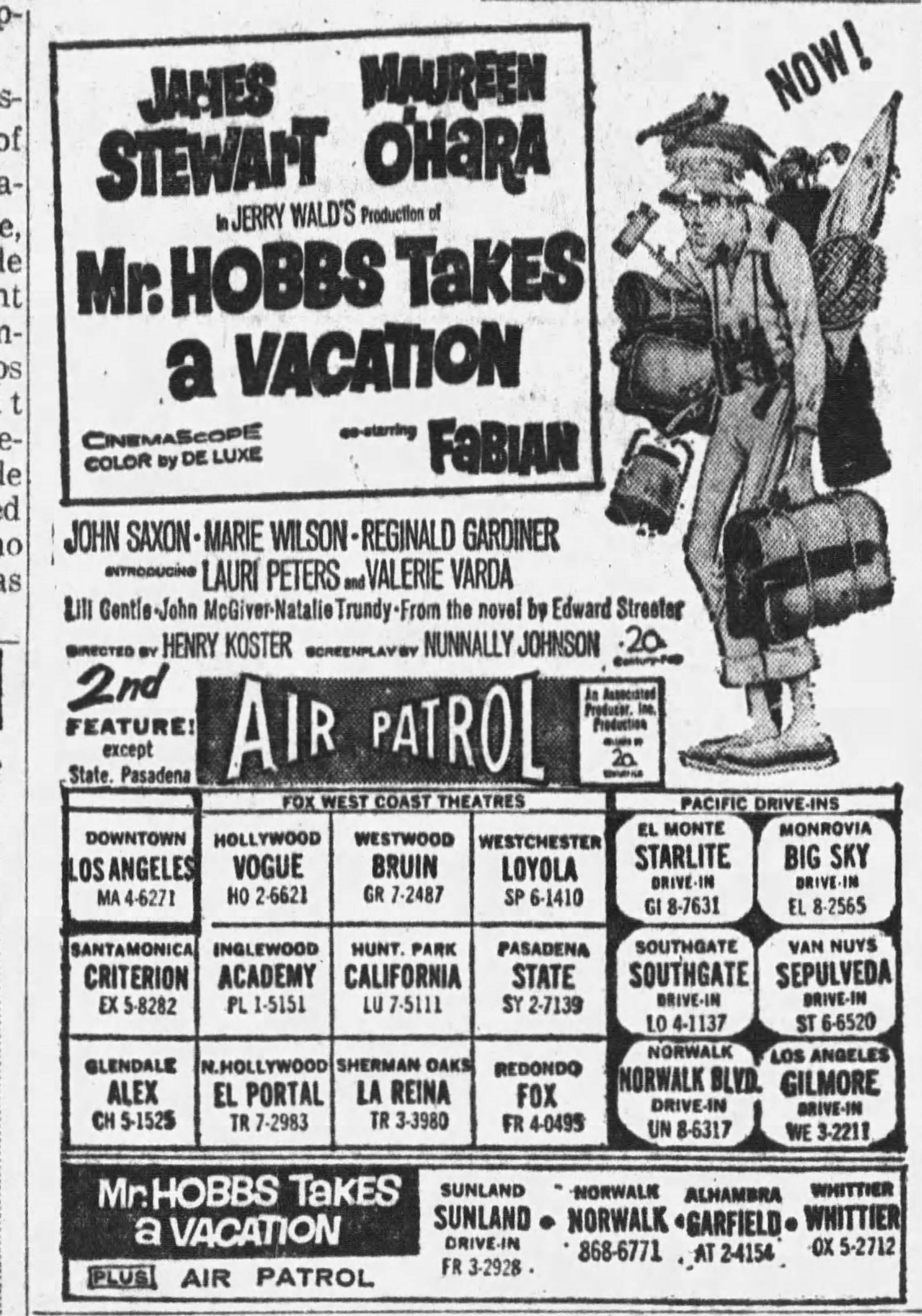 The half a movie was entitled Air Patrol, which sounds like it would be a 1940s Republic serial but was, in fact, a low-budget C-movie meant for the bottom half of a double bill, one of many Fox films from their programmer branch, this one directed by Maury Dexter, who did a lot of grade-C movies starting in 1960. I happen to love black-and-white scope movies, and any movie whose first shot is a location shot smack dab in the middle of Wilshire Boulevard’s Miracle Mile is okay by me. In fact, the film was most likely either shot in late 1961 or early 1962, as it came out on July 4, 1962. I believe it must be the first ever appearance of Lee Tower, the LT building, which was touted as LA’s first real skyscraper and a building that changed the landscape of the Miracle Mile – more came later after that door was open, but Lee Tower was first and it was a stunning building back then, a mix of old and new, style-wise. Located at 5455 Wilshire and still there, it was just a block or two east of the Prudential building and Ohrbach’s department store. We get many great views of the exterior of the building as well as its roof. I’m hoping for a few more shots of Wilshire or other fun LA locations. The film runs a very brisk sixty-two minutes. Here’s its opening day ad – the top half of the bill was Mr. Hobbs Takes a Vacation, which I must have seen at the Bruin, if memory serves, unless I saw it at a Major Studio Preview at the Village, which is where I thought I saw it. It’s probably easy to check so maybe I’ll check. But if I saw it at the Bruin I probably didn’t stick around for Air Patrol. Well, no preview of it at the Village, but before it went wide with Air Patrol, it played a one-month run at the Wilshire and I may have seen it there. It also previewed there a week before it opened. I do have a Lee Tower story, though. I believe the building opened in very late 1960 but more likely in very early 1961. In any case, sometime before it opened, probably around November of 1960, just prior to my Bar Mitzvah, the Kimmel clan all went to Lee Tower on a Saturday to see what was maybe going to be my father’s second attempt to open a restaurant on the Miracle Mile – his first attempt in the late 1940s, the Miracle Mile version of his Kiru Restaurant, was a huge failure, lasting less than two years, with the building housing Du-Par’s just six months after the Kiru Café closed. So, he and whatever shady folks he was dealing with back then, thought about opening another Kiru in Lee Tower on the top floor, which, of course, had spectacular citywide views on all four sides. Here’s the ad for Mr. Hobbs and Air Patrol.