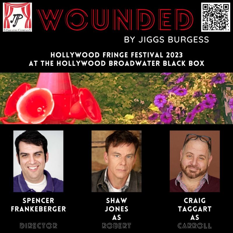 The proverbial phrase “revenge is a dish best served cold” is the mantra for Jiggs Burgess’s new play Wounded at the Hollywood Fringe Festival. It may be hot on the back patio of Carrol’s (Craig Taggart) Texas home, but he has arranged an extravagant afternoon tea for his old high school buddy Robert (Shaw Jones). Director Spencer Frankeberger’s production contains one of the most elaborate sets ever seen by this reviewer at Fringe. There are mountains of delicious looking pastries strewn across two large tables, tastefully set off by a few beautiful flower arrangements. There may be hummingbirds, cats and even a three-legged dog outdoors, but there is also a very dangerous Venus Flytrap just waiting for its victim.