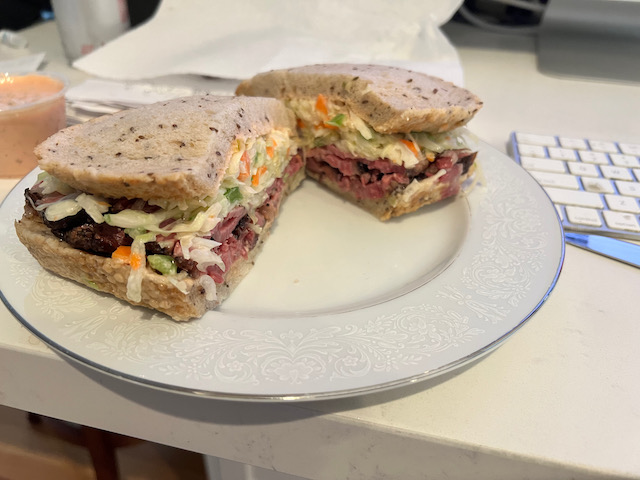 Well, dear readers, the final proofing is done – found about twenty little things to fix, plus one global thing they can’t do until they enter all the little fixes. The global thing is easy. Thankfully, we caught some bad errors, misspellings, missing quote marks – that kind of thing. I just finished getting it all typed up and sent, which is why I am starting these here notes late. Proofing was basically the entire day and evening yesterday. I had a rough night and only five hours of sleep, IF that. Once up, I answered e-mails and did a few things that needed doing. Then I began proofing from where I’d left off. Food arrived at noon-thirty and what food it was – a number one from Langer’s – pastrami on double baked rye with coleslaw and Russian dressing. Even though Langer’s is a good twenty-five-minute drive, the sandwich still had some warmth left in the pastrami. It was great, as always. I’d also ordered a little thing of chicken salad and I ate that in the early evening and it, too, was great.