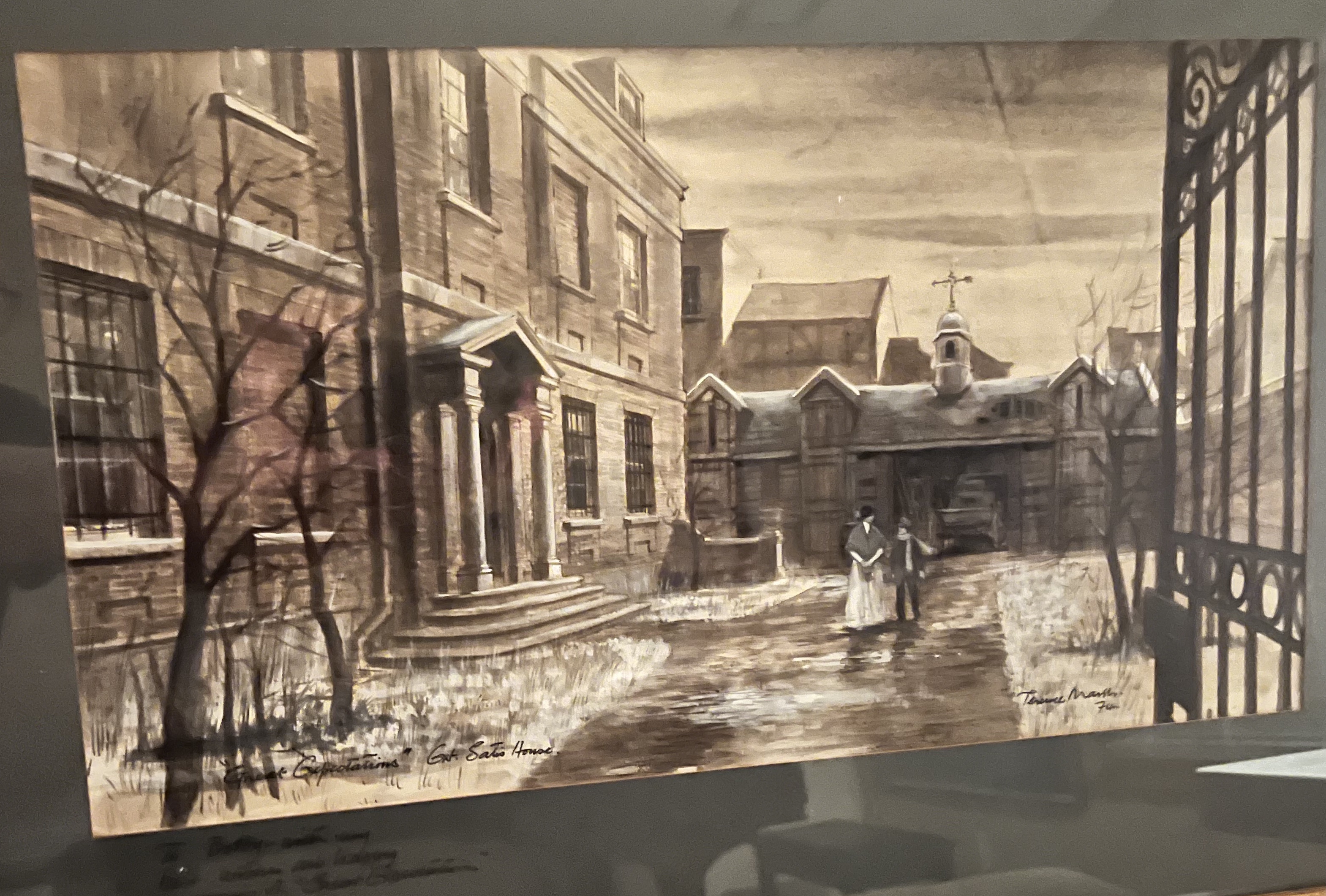 While this isn’t from films of that caliber – in fact, it’s from a not well thought of TV movie version of Great Expectations, but it’s still a thrill to have it. Aside from Marsh’s signature on the art itself, he’s signed it on the mat, “To Bobby” – it only took a minute to know that “Bobby” is producer Robert Fryer. What a bargain this was. I have to take it to my local framer and have them put wire on it so I can hang it – IF they charge me, it won’t be more than five or ten bucks for that. Here’s what it looks like, although no way around the glare, I’m afraid. This is EXT. SATIS HOUSE.