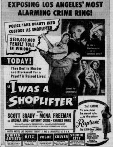 Well, dear readers, isn’t it fascinating? Isn’t WHAT fascinating and given that it’s fascinating, perhaps I should tell you what I find fascinating because, after all, I have a fascination with the fascinating. What I find fascinating are connections. Yes, you heard it here, dear readers, I find connections fascinating. For example, last night I watched a movie called I Was a Shoplifter, a Universal movie starring Scott Brady, Mona Freeman, Andrea King, Anthony Curtis, and others. It’s about a shoplifting ring in Los Angeles, California. I suppose you could call it a noir of sorts. It was directed by Charles Lamont, who directed a few movies – like over 200 of ‘em. Very prolific was Mr. Lamont. He directed nine of the Abbott and Costello movies, many Ma and Pa Kettle movies, and obviously tons of others, including Carolina Cannonball starring Judy Canova, which I saw at the Picfair Theater. He began making films in 1922, comedy shorts for Mack Sennett. First off, you have to love any film who’s opening shot is the exterior of Ohrbach’s department store on Wilshire Boulevard. In fact, the entire opening sequence was shot inside Ohrbach’s. The writing isn’t very good, but its seventy-three minutes moves along very quickly. I thought it was some bottom of the bill thing, but no, it had top of the bill and played nice theaters – the Ritz on Wilshire (which is on view in one of the movie’s process shots), the Vogue in Hollywood – not top rank but nice theaters, nonetheless. Here’s the opening day ad.