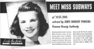 It’s actually quite well directed, you get some nice shots of Tijuana, and a few L.A. locales. Here’s where the fascinating kicks in. Star Scott Brady’s real last name was Tierney – his brother was tough guy actor Lawrence Tierney. Isn’t that fascinating? Brady did quite a few movies and a whole ton of television. There there’s Anthony Curtis who, just one film later would drop the formality of his first name down to Tony. Also in the movie, unbilled in a two-line role was someone who’s fourth tiny role it was – a guy named Rock Hudson. Isn’t that fascinating? Then there’s sultry Andrea King, who I saw many times on Channel Nine’s Million Dollar Movie when it showed The Beast with Five Fingers. After her movie career fizzled, she did what all actors back then did, became a prolific presence on TV. She also became an author of children’s books. Fascinating. But the most fascinating thing in I Married a Shoplifter was Miss Mona Freeman. I’d never seen her in anything prior to last night’s viewing and I was completely taken with the twenty-three-year-old her. Beautiful, decent actress, her first big thing was being named the second Miss Subways in New York in 1941 at the ripe old age of fourteen. Some articles say she was the first and one says she was the second but has no information on the first, so who knows. Here she is as Miss Subways.