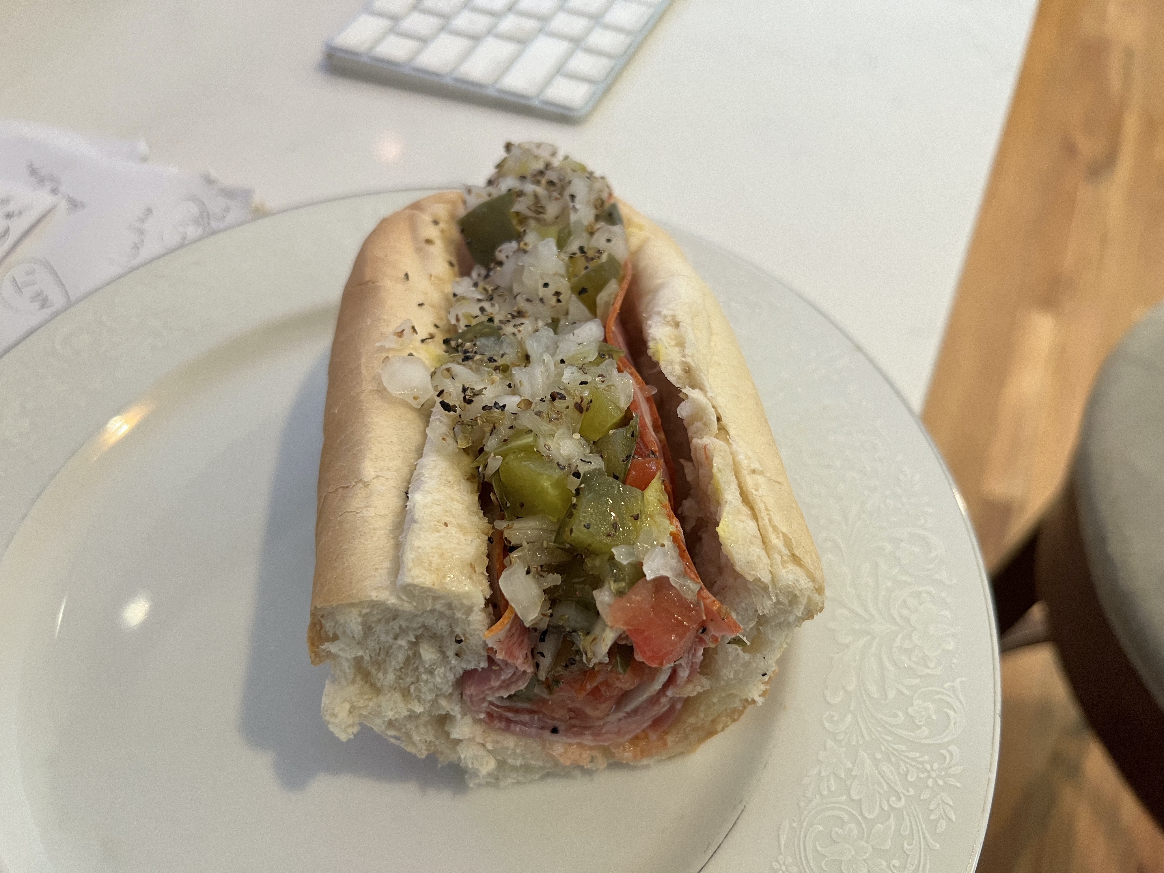 Well, dear readers, the culprit was the coil. Yes, you heard it here, dear readers, the culprit was the coil or, conversely, the coil was the culprit. I am, of course, speaking of the air conditioner/heater unit. The A/C man arrived at eleven. He told me in advance, just like last time, that he wouldn’t be able to figure out what’s wrong if we turned it on and it wasn’t doing what it’s been doing – that was the problem last time we had the problem. So, we turned it on and happily it WAS doing what it was doing so no excuses this time. After sussing things out on the roof and in the attic, he announced that the coil was the culprit and that he’d have to order the part, which he’s done, but with no ETA for its arrival. Hopefully, it will be sooner than later. He said what it’s been doing is just recycling the air in the house. That kind of recycling we don’t need. He’ll also put in a new filter. Prior to that, I got six hours of sleep and got up just before nine, thanks to the tree people – not the actual people dealing with the tree, but the machine in front of the house that grinds all the tree parts into dust. It was – LOUD. I got up (like I had a choice), answered a lot of e-mails, got an irritating text, which I, of course, ignored. Then the A/C guy came, and you now know that the culprit was the coil. Then I decided to try a sub place that is near where Marshall Harvey lives and which has been there for decades, called Santoro’s. I ordered the Eyetalian cold cuts, of course, and while it was a bit far away, it arrived in thirty-five minutes. When one has been only having fast food versions of sub sandwiches, one forgets what a real sub sandwich looks like and tastes like. Subway, Jersey Mike’s, Firehouse and others like those chains are all fine until you get the real deal and Santoro’s is the real deal. It doesn’t come with a huge amount of meat, which is fine because I don’t know where they’d put it, although you can order with extra meat. But I found it just right – salami, capicola, and provolone with seasoned and cut up tomatoes, pickles, and onions and some olive oil. Hard to describe, so I took an actual photograph of one half of the actual sandwich.