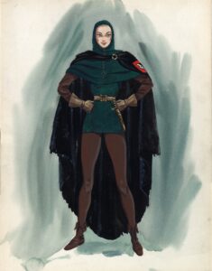 Now, for those who may not know what this is, it’s an original Edith Head costume sketch dated October 1954, initialed by her on the backside. It’s for the character of Maid Jean played by Glynis Johns in – The Court Jester. There were several sketches done for this costume, and one of those sold at a Heritage Auction some years ago but isn’t as good as this one. The actual costume differs slightly from my sketch but is fairly close. It is the outfit she wears in her first scene with The Fox. Isn’t it lovely? I know where it will hang, which requires me to move one piece up and move the piece that was there back to where it originally hung, and what replaced it is easy to hang somewhere else. Anyway, I love it large.