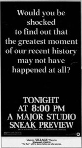 Well, dear readers, I’m still listening to the movie music of Ernest Gold and it’s still lovelier than lovely. I am still sitting here like so much fish. I am still an about to be older Jew. I am still a curmudgeon. I still have too much phlegm. I am still crazy after all these years. I am still in need of a hefty modern major miracle. I am still writing these here notes in the still of the night. Has anyone noticed there’s a whole mess o’ stills going on? That is a lot of stills – still, there may be more to come. Remember, still waters run deep, and deep waters run still. Wait – all of a sudden, my heart stood still. It’s fine now. Still, did you know that behind the hill there’s a busy little still? Well, let’s be really still and maybe we can move on to something else. For example, I watched a motion picture last night – one I still always enjoy watching – Capricorn One. I first saw it at a sneak preview at the Village Theater in 70mm and stereo. The audience went wild and everyone there thought it was going to be a HUGE smash. It wasn’t – very odd. It’s very well cast, it’s fun, exciting, well-directed and has a great Jerry Goldsmith score to boot. Anyway, it was very enjoyable all over again. Just to prove that my memory is infallible, Friday, April 18, 1976, sneak preview at the Village (and yes, I was there for The Fury beforehand).
