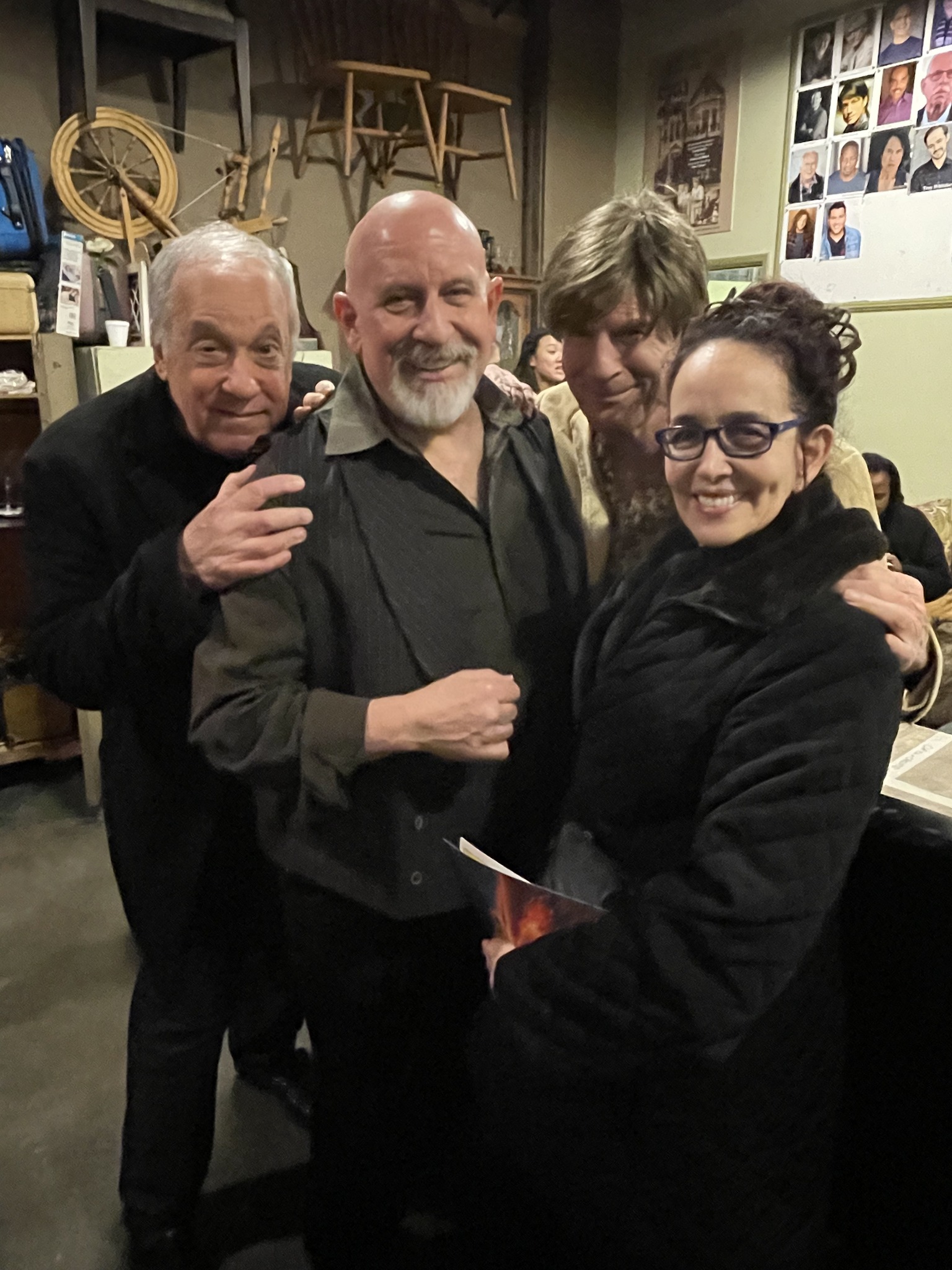 One of the lovely things that Group Rep does for opening night is a free after-party for the entire audience. Anyway, I’ll have some photographs soon. Well, here’s one I have that’s handy – left to right – me, Jerry Sternbach, critic Steven Stanley, and director Cate Caplin.