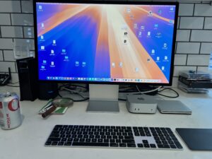 Well, dear readers, I am writing these here notes on the new computer known as Mac Mini and Apple Display monitor of 27-inches. Whilst doing it, I am listening to music, namely Pete Jolly’s Little Bird album, which was one of my favorite early teen records, mainly because it had the theme from To Kill a Mockingbird – that was the reason I got it, but I fell in love with every selection and then bought every Pete Jolly album that came after. I’m also cooling down the house, which was eighty-two degrees. But let’s talk about the new computer, shall we? Using the Thunderbolt 4 cord getting all the old computer onto the new computer took two hours, instead of the twelve or more it would have taken doing it any other way. The fellow in the back house helped get everything going with the data transfer. We kept the old computer hooked up as I had to get the notes posted. But right after midnight, the migration was complete. We’d already paired the new keyboard and trackpad. As soon as it was finished, it restarted itself and I began checking everything. All the stuff I was worried about, like Mail and Microsoft Office and Music actually worked perfectly. The only one I had to do something with was Word – and that took all of three seconds – I opened a document, it asked me if I wanted Microsoft Office on this new device, I clicked yes, entered my password by using touch ID, and that was that. The Music folder came over perfectly with all tracks and playlists there and ready to play. And Mail also came over perfectly – never had to type a password. I didn’t care for the default desktop image, so I found one I liked and changed it. Anything I had a question about I found easily on Google. There are a couple of quirky things I have to get used to, but other than that this thing is absolutely amazing. Remember, my computer was over a decade old and oh, I forgot to mention that it crashed three times in a row – I think we got this in the nick of time. On the old computer, everything took forever, especially opening Word documents and trying to use Chrome, which I don’t use much, and the hiccups on websites, getting DoorDash to load properly – all that stuff is instant. The ONLY thing that’s taking a long time is syncing to the Cloud – according to Google that could take several days. Once that’s done, I’ll be able to do backups again. I was up until two-thirty playing around with everything, including listening to the array of internal speakers. My speakers are better, and I decided to hook them up, which I did in the morning, but I thought the internal speakers weren’t that much different, and so I put the external speakers in another room and when I get a good turntable, I’ll use them with that. The CD drive works great and so I’ll be able to upload CDs again easily. When I think of the stupid way I had to do those big box sets, this will be a joy again. Losing the speakers makes everything look really neat on the computer table. The ONLY thing that’s awful still are these damn barstools, which kill my back and whose screws have to be tightened three times a week. To that end, I have new barstools coming on Saturday and someone coming on Sunday to assemble them. They look much nicer and certainly look much sturdier. And so, I am a happy computer lad. Here is an actual photograph of the new keyboard, display, the Mac Mini is directly under it on the right and next to that is the CD drive. Next to the big boy keyboard is the new trackpad.