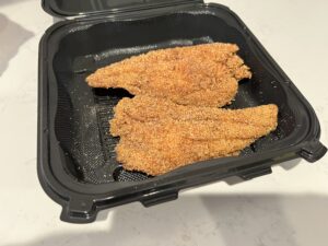 Well, dear readers, Tubin or not Tubin, that is the question. And the answer is simple: Why has it taken me over thirty years to revisit this composer’s music? I began with his first symphony, which was great and am just going through everything – right now Music for Strings, to be followed by his second symphony (ten in all with an incomplete eleventh). Tubin was an Estonian composer, conductor and, most interestingly, choreographer. Anyway, this will be my listening for the next few days. All these are free downloads if you have Apple Music, but I’m sure they’re all on the Tube of You as well. Now, maybe someone can answer the age-old question of why do I suddenly feel like pizza? At eleven-thirty at night? Happily, I don’t think there are any pizza slice places open and mostly you get the bad chains. But today – I may just have to do Dino’s or something resembling Dino’s. Something Resembling Dino’s – that’s the title of my next novel. So, yesterday was a weird little day. I got six hours of sleep, had a little eBay irritant to work through with the fellow who’s returning the window card, but that’s all fine now and tomorrow morning I’ll fill out all the UPS forms for my insurance money. It covers most of it, so that’s good. I have lots of photos, the most damning of which is the package itself, which some idiot UPS person literally bent in half, despite all the DO NOT BEND stickers everywhere there could be one. What a pain. The poster itself is on its way back to me. I may offer it at a bargain price IF the fold isn’t noticeable in a frame. I had a good e-mail with some really good news, at least potentially really good news. Then we had our rehearsal. The first hour was me and the dance captain and I did the duet that required ography. The song is a fairly well-known tune from a big MGM movie, and I’m just borrowing most of what we’re doing from that because I think it’s fun to have it look like that with the new lyrics. Now, our two actors who’ll be doing it can’t do the hard stuff, so I simplified all that. I think we got 80% of it done and I know the ending already. Then for the next two hours we drilled, finessed, and things are looking very good now. The most amazing thing to me was a little Charleston we do in one number. No one knew what that was, the Charleston. And you’d be amazed how difficult it was for them to get it down. I always tell people, if I can do it anyone can do it. Anyway, it’s all coming along, and I did block a non-musical sequence, too. After that, I stopped at the mail place and got the UPS claim thing in the works – the rest is done online. Then I came home and ordered fried catfish, which I really wasn’t in the mood for, but I was impatient to order, and I knew that was fast. It arrived and was good but – I wasn’t in the mood for it. I finished it of course and it was of its usual quality. Here is an actual photograph of Uncle Andre’s fried catfish. I saved the potato salad for a later snack.